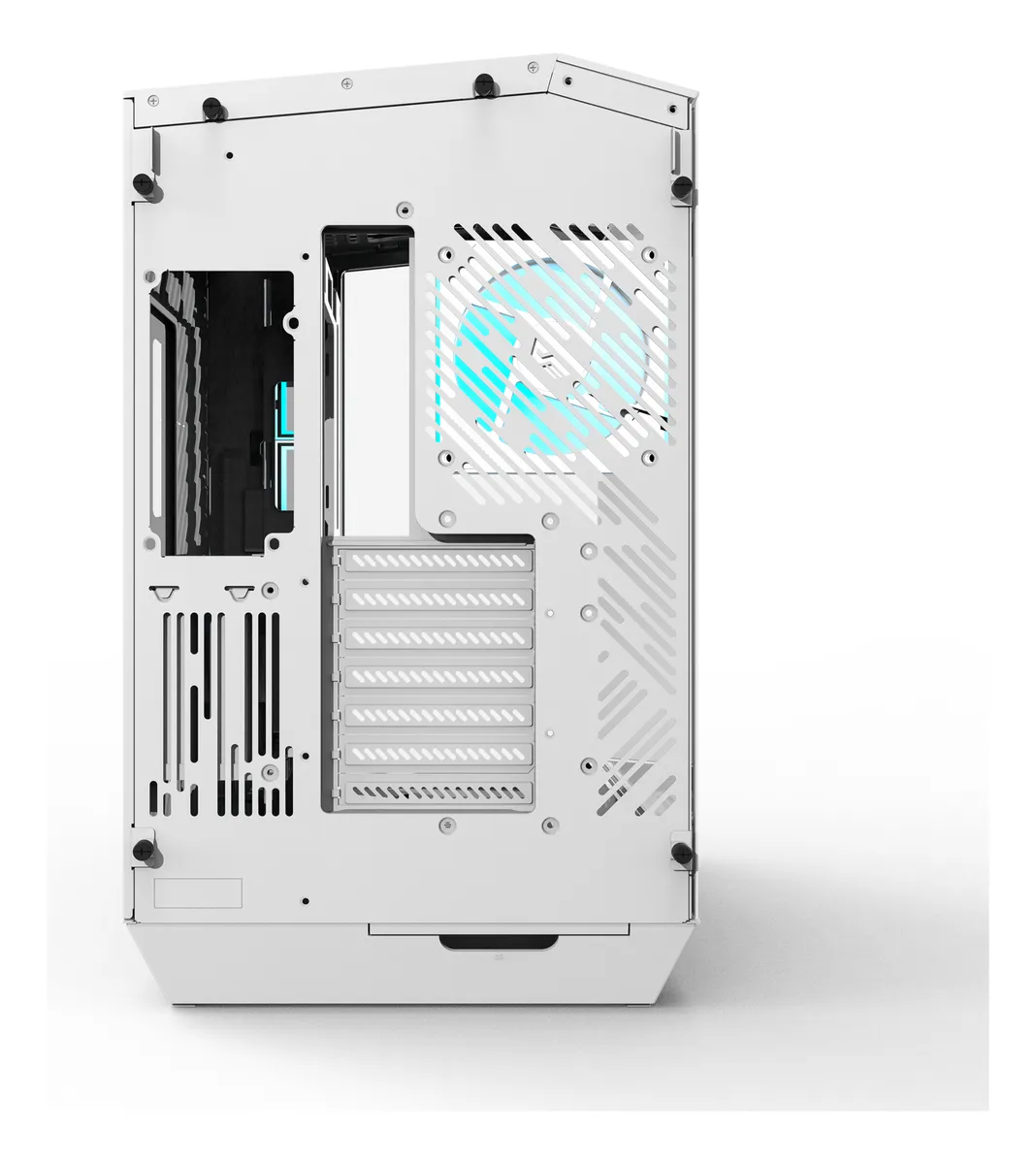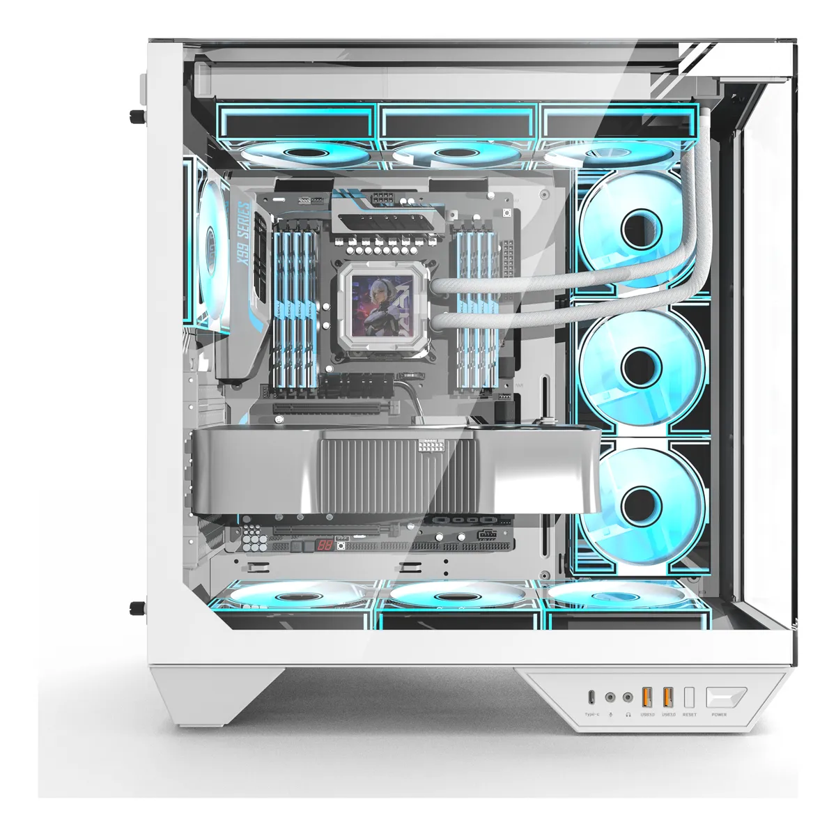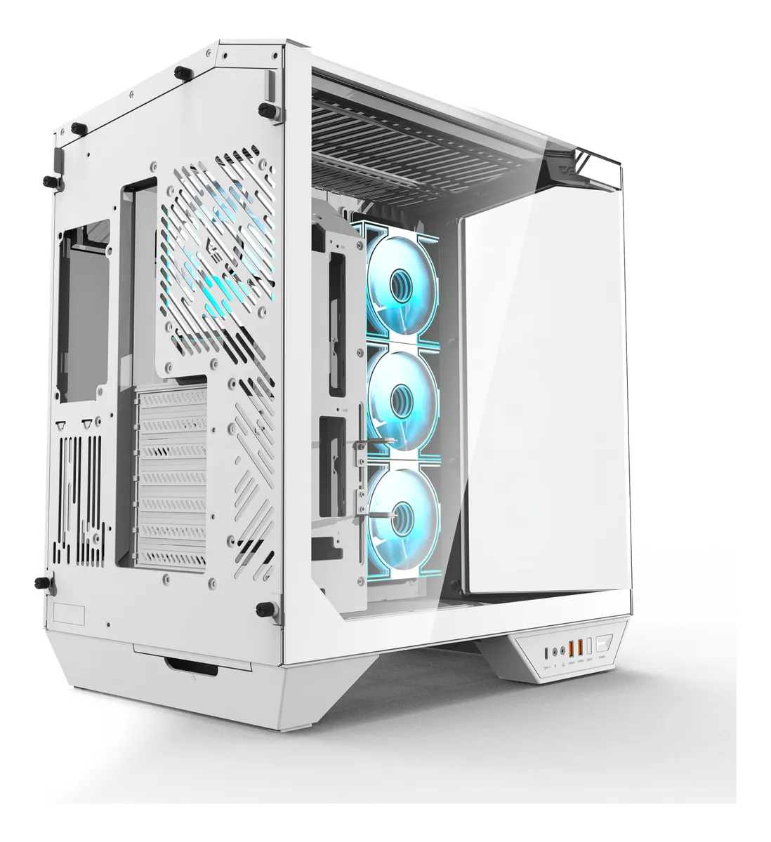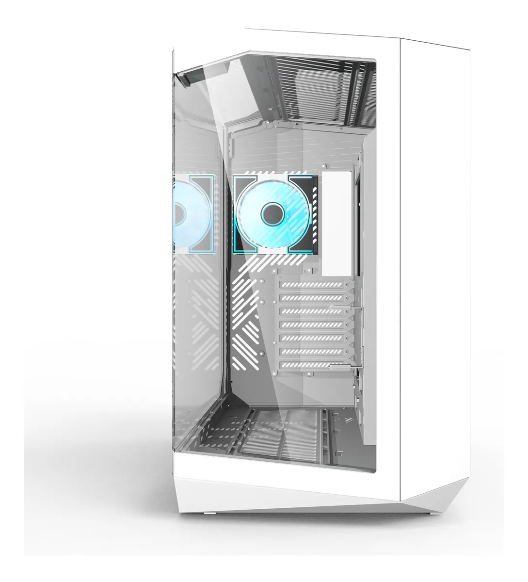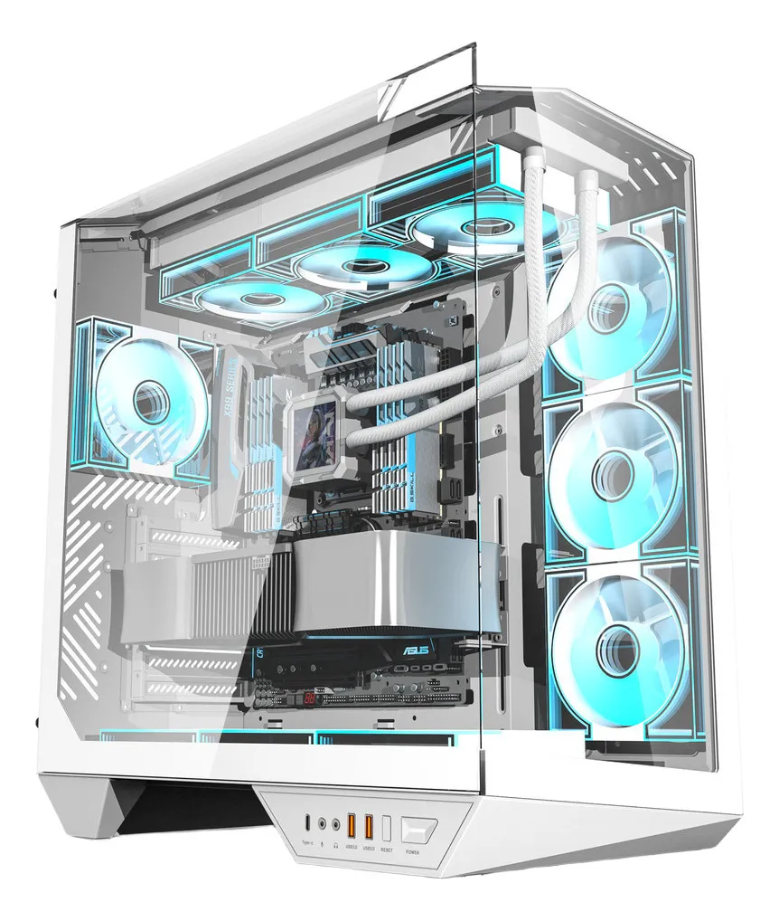Su panel lateral y frontal de vidrio templado continuo en forma de “L” ofrece una vista panorámica de 330°, permitiendo mostrar cada detalle del setup.