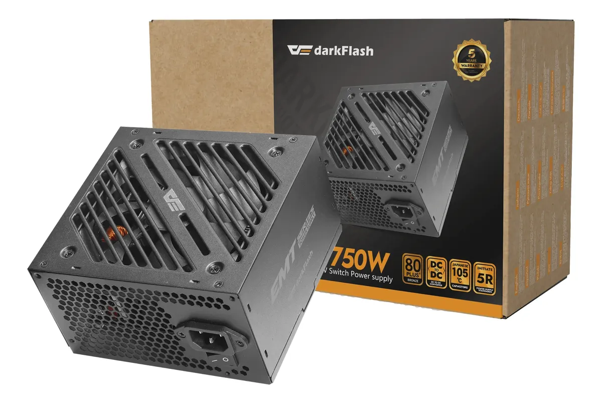 La DarkFlash EMT750 entrega 750W reales con certificación 80 Plus Bronze, asegurando una eficiencia superior al 85%. Su diseño DC-DC y riel único +12V concentran la potencia donde más se necesita, ofreciendo estabilidad incluso bajo cargas exigentes.