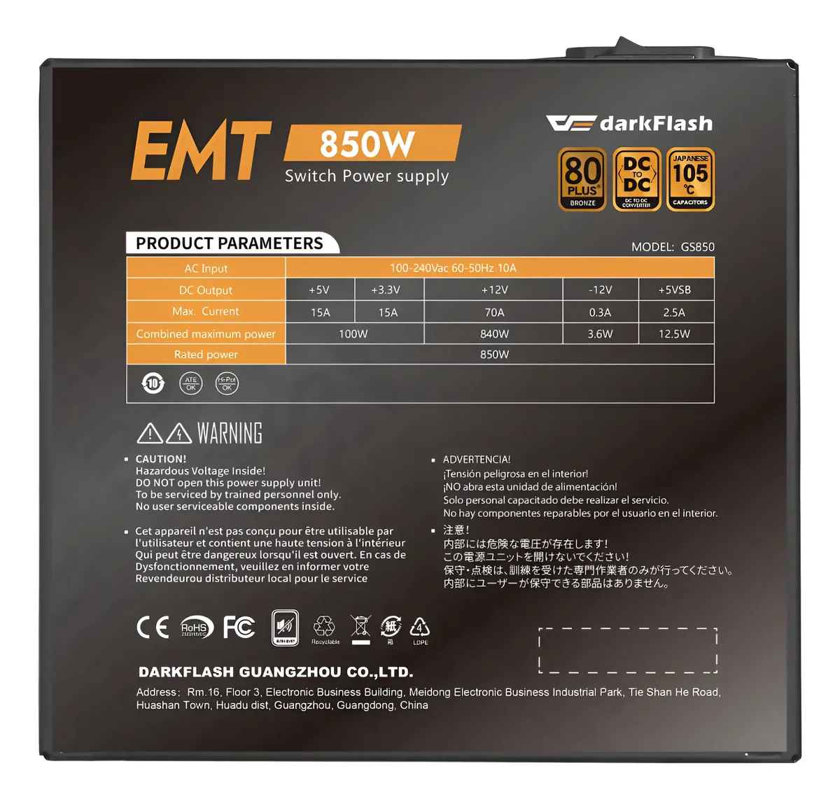 🔋 Fuente de Poder DarkFlash EMT850 ATX 850W 80+ Bronze – Negro