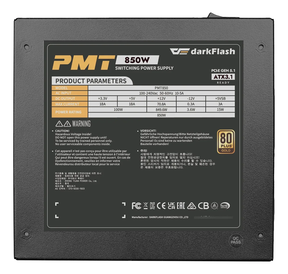 La DarkFlash PMT850 entrega 850W reales con certificación 80 Plus Gold, alcanzando hasta un 93% de eficiencia energética. Su topología PFC Activo + Half Bridge LLC + SRC + DC to DC garantiza una alimentación estable y precisa incluso bajo cargas intensas.