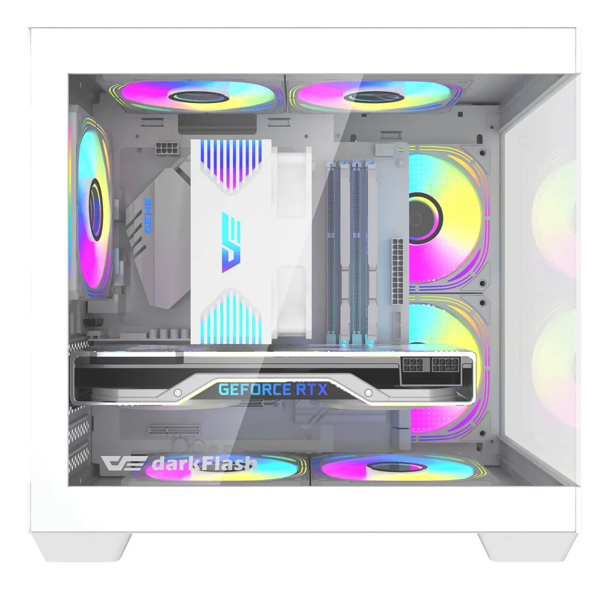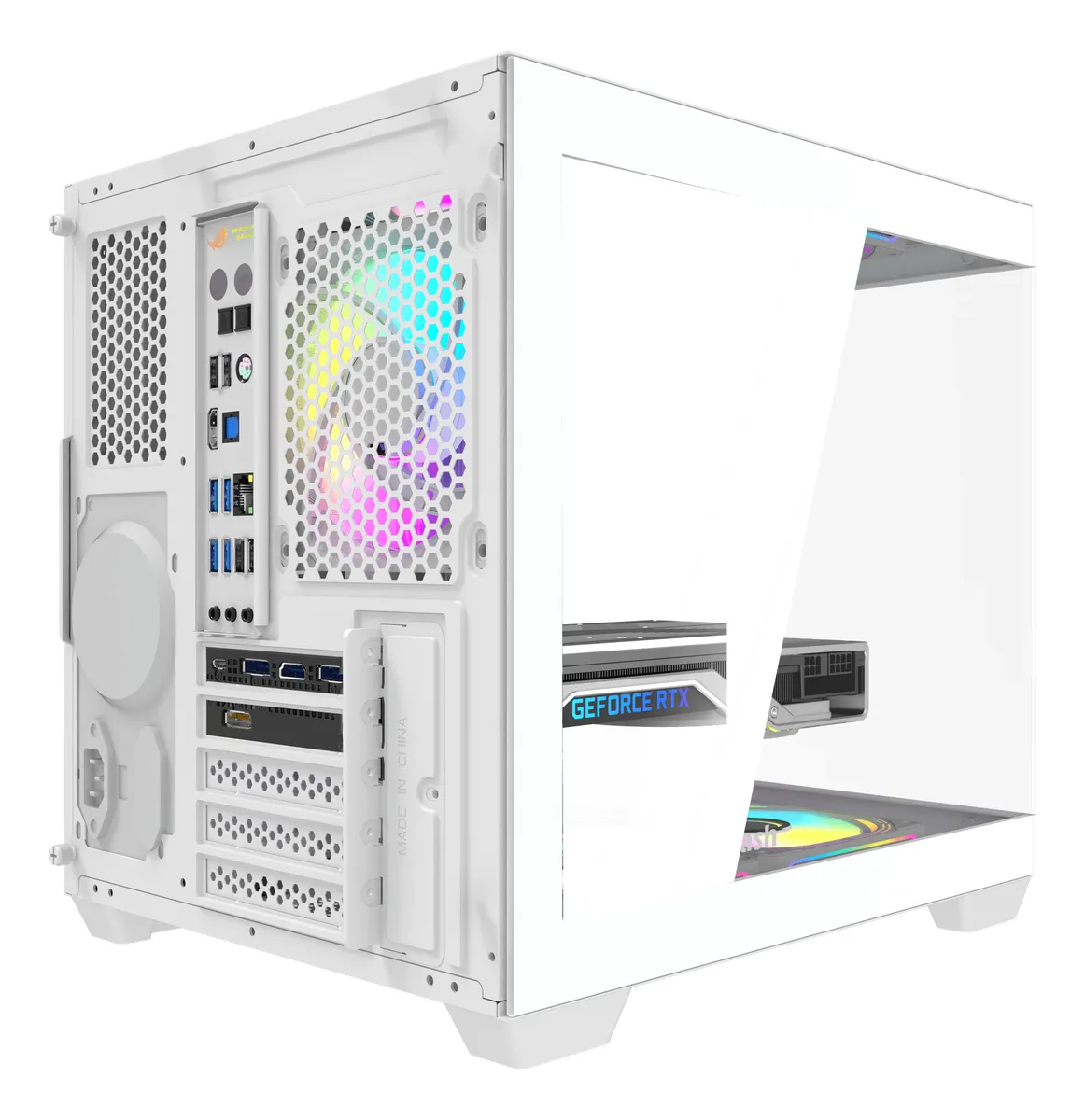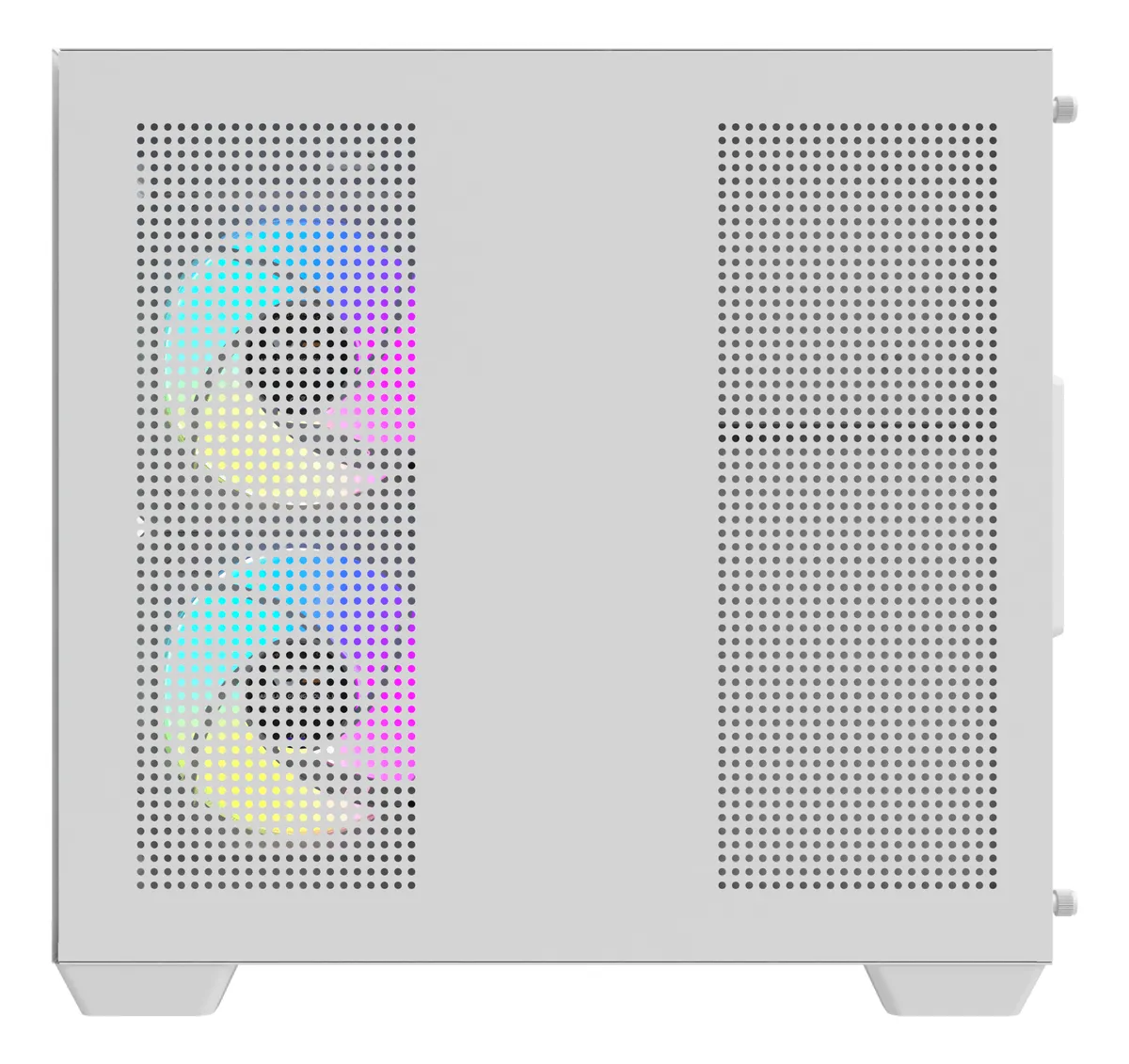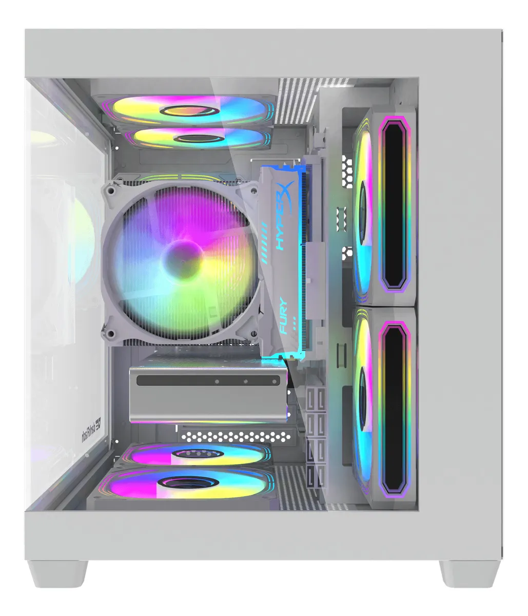 Su panel frontal mallado asegura una excelente entrada de aire, mientras que el panel lateral de vidrio templado muestra los componentes internos con una vista panorámica limpia y profesional.