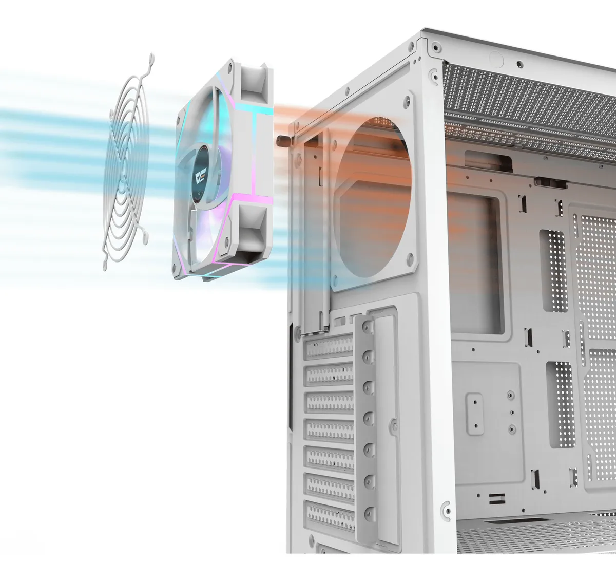 Fabricado en acero SPCC de 0.5 mm, ofrece un chasis robusto y amplio espacio interior.