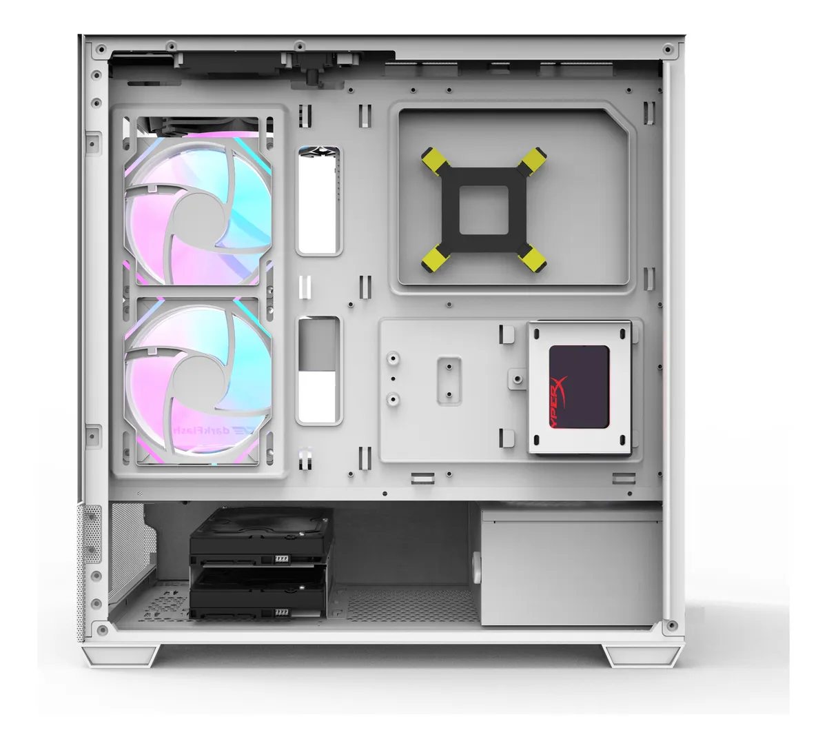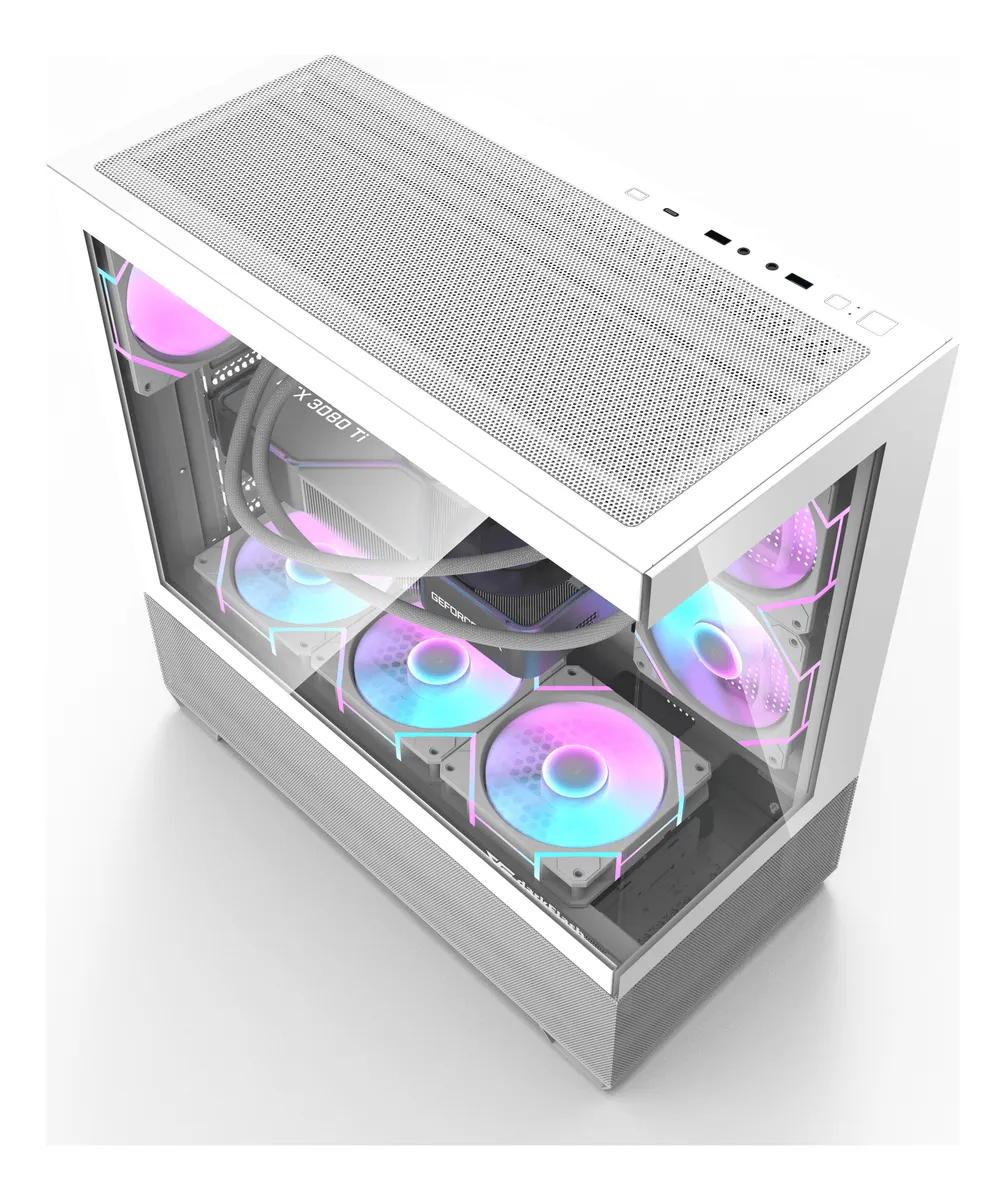 El DarkFlash DS900 Air combina un diseño de alto flujo con estética premium, integrando un panel de vidrio templado en forma de “L” de 270° que cubre el frontal y lateral para una vista panorámica sin pilares.