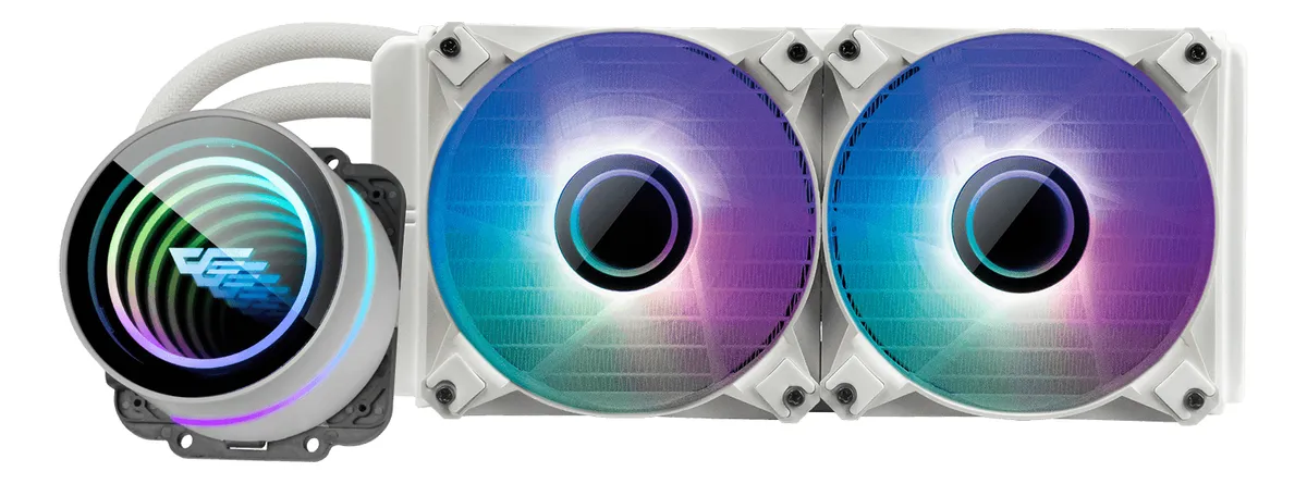 El radiador de 240 mm fabricado en aluminio y los dos ventiladores PWM de 120 mm con doble anillo ARGB ofrecen una disipación de calor excepcional, soportando CPUs de hasta 275 W TDP. La base de cobre pulido CNC mejora el contacto térmico, mientras que los tubos mallados FEP de 400 mm aseguran durabilidad, flexibilidad y cero fugas.