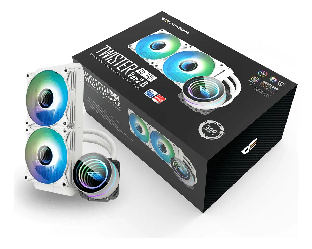El DarkFlash Twister DX-V2.6 destaca por su bloque de bomba con efecto Infinity Mirror rotatorio de 360°, que proyecta una iluminación ARGB personalizable desde todos los ángulos. Su estructura cilíndrica con logotipo iluminado realza la estética del setup y aporta un acabado de nivel entusiasta.