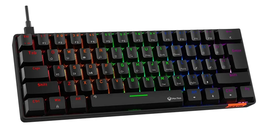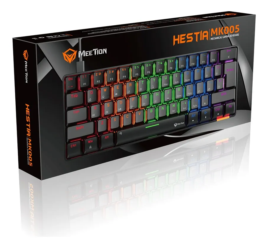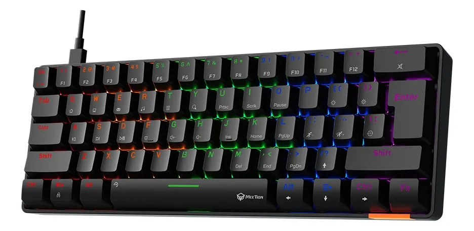 El Meetion MK005 adopta un formato 60 % de 62 teclas, ideal para quienes buscan un teclado liviano y eficiente que libere espacio en el escritorio. Su estructura sólida y cable trenzado desmontable garantizan portabilidad y estabilidad en cada sesión.