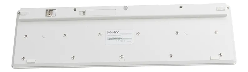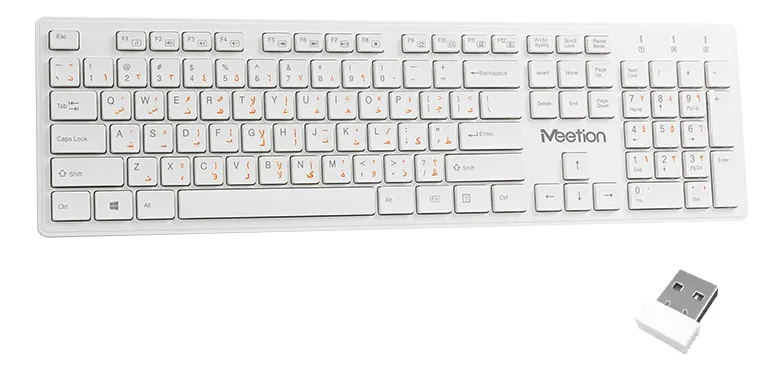 El Meetion WK841 Febo combina un estilo minimalista con un formato completo que incluye teclado numérico. Su perfil plano y acabado blanco ofrecen una estética limpia y profesional, ideal para escritorios elegantes o ambientes de trabajo luminosos.